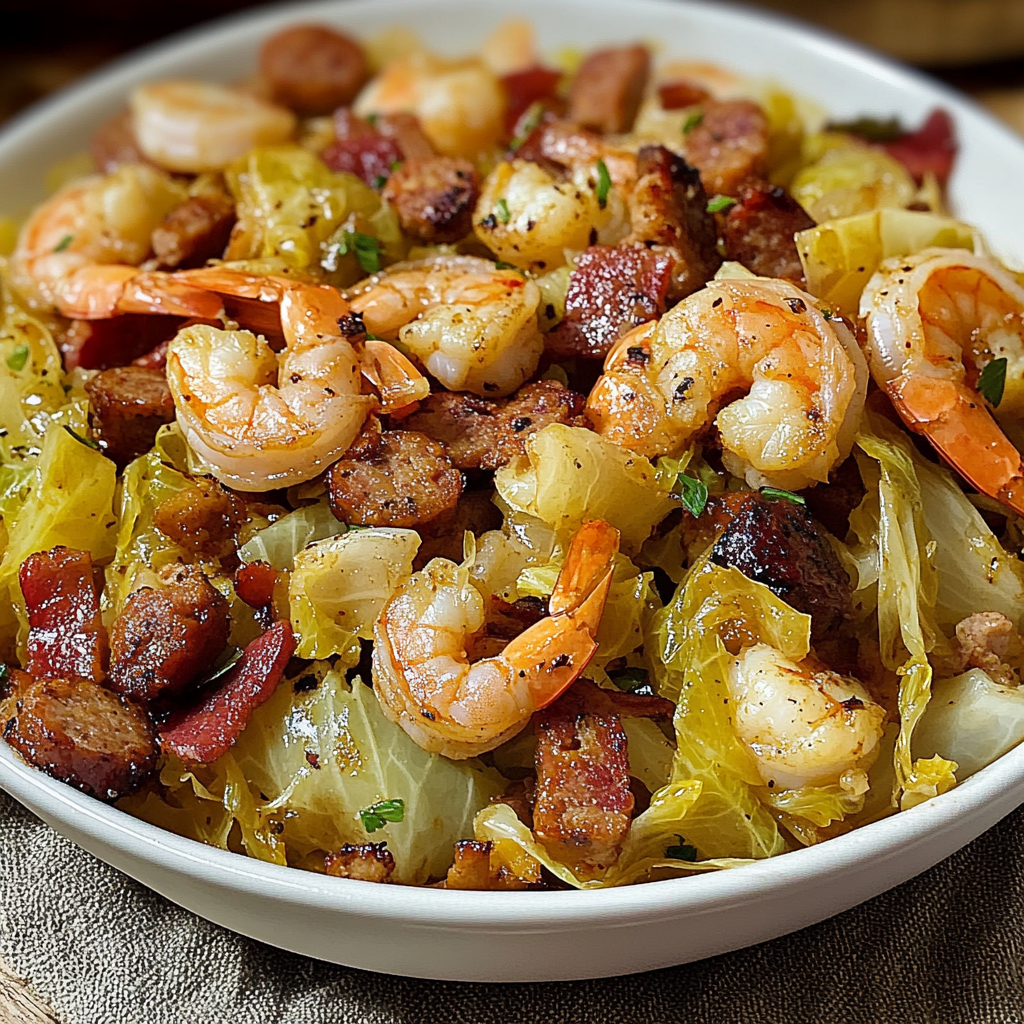 Ce plat est non seulement délicieux, mais aussi riche en nutriments. Le chou est faible en calories mais riche en fibres, vitamines K et C, ce qui en fait un excellent aliment pour la digestion et la santé osseuse. Les crevettes apportent des protéines maigres et des acides gras oméga-3 bénéfiques pour le cœur. Le bacon et les saucisses, bien que plus riches en matières grasses, ajoutent des protéines supplémentaires et une saveur inégalée. Avec seulement 350 calories par portion, ce plat peut être un excellent choix pour ceux qui cherchent à se faire plaisir sans culpabilité.