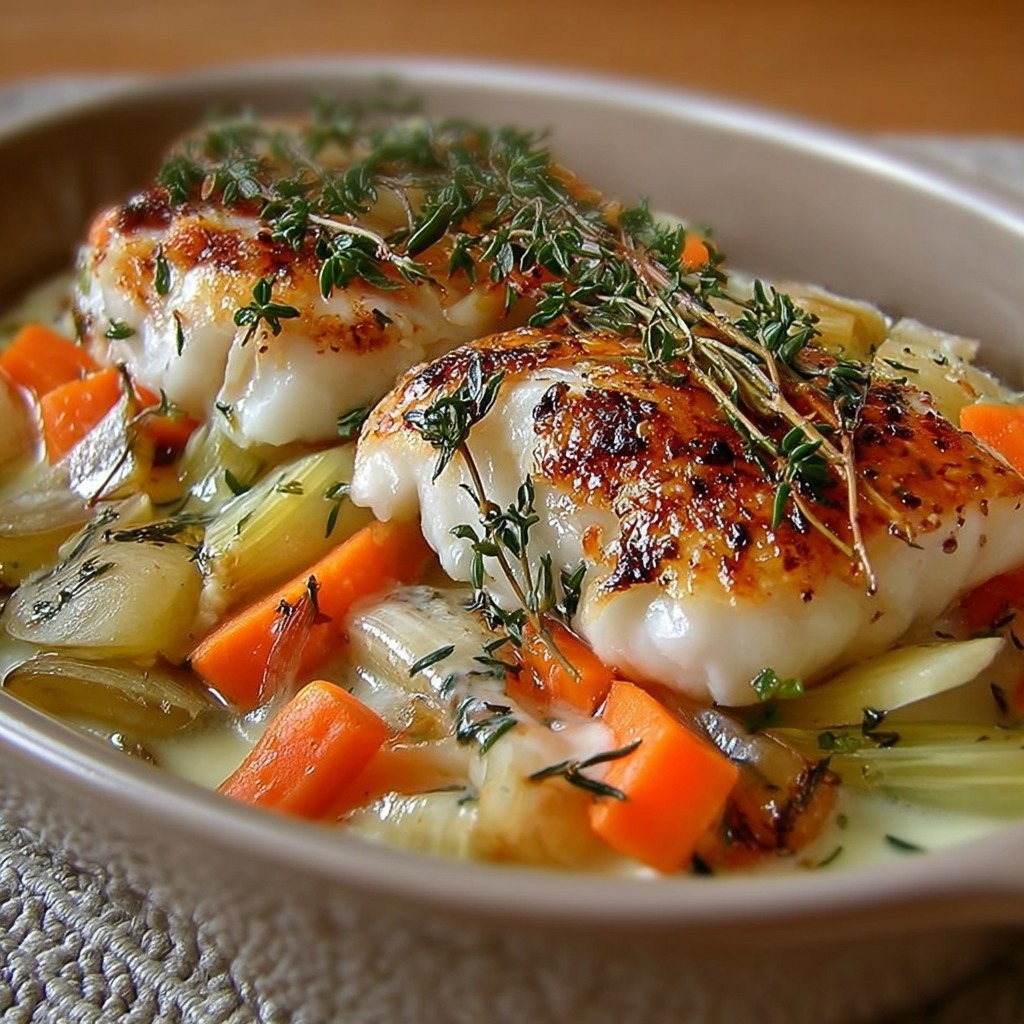 Le cabillaud au four avec petits légumes et crème au thym est un plat raffiné et savoureux, combinant la délicatesse du poisson blanc avec la douceur des légumes de saison et le parfum aromatique du thym. La cuisson au four permet de conserver toute la tendreté du cabillaud, tandis que la crème infusée au thym apporte onctuosité et profondeur aux saveurs. Ce plat est idéal pour un repas familial ou un dîner élégant, léger et gourmand.
