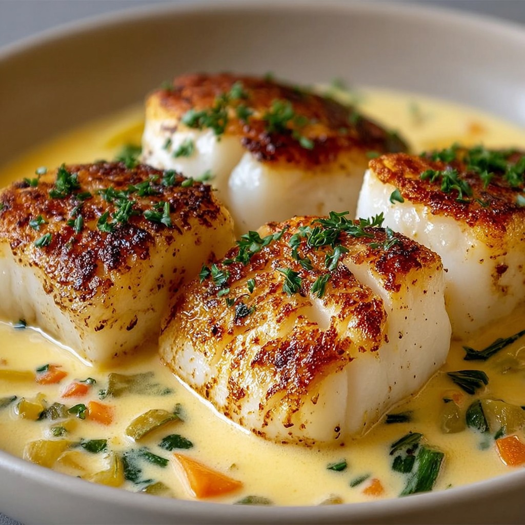 Le cabillaud rôti est disposé sur l’assiette, nappé de sauce crémeuse aux petits légumes. La présentation peut être agrémentée d’herbes fraîches ciselées pour apporter une touche aromatique et colorée.