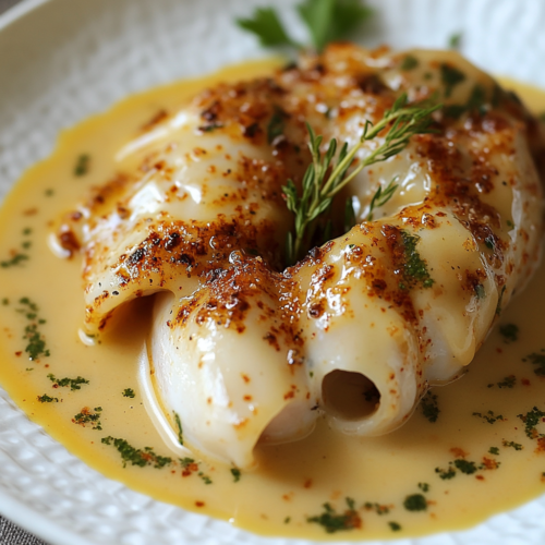 Une fois les calamars cuits et la sauce bien réduite, retirez-les délicatement de la poêle et dressez-les sur des assiettes. Arrosez-les avec la sauce armoricaine restante et garnissez avec un peu de persil frais haché pour apporter de la couleur et de la fraîcheur.