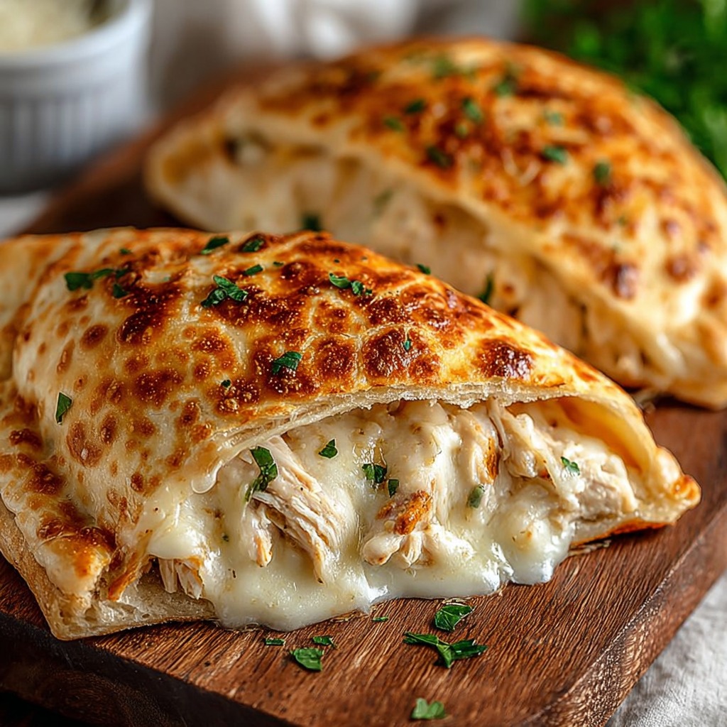 Une fois cuits, les calzones sont laissés à tiédir légèrement pour stabiliser la garniture et faciliter la découpe. La texture finale offre un contraste parfait entre l’extérieur croustillant et l’intérieur crémeux et fondant, avec le poulet tendre et la sauce Alfredo parfumée enveloppant le fromage filant. Le parmesan gratiné et la mozzarella fondue créent une combinaison gourmande et aromatique qui séduit à chaque bouchée.