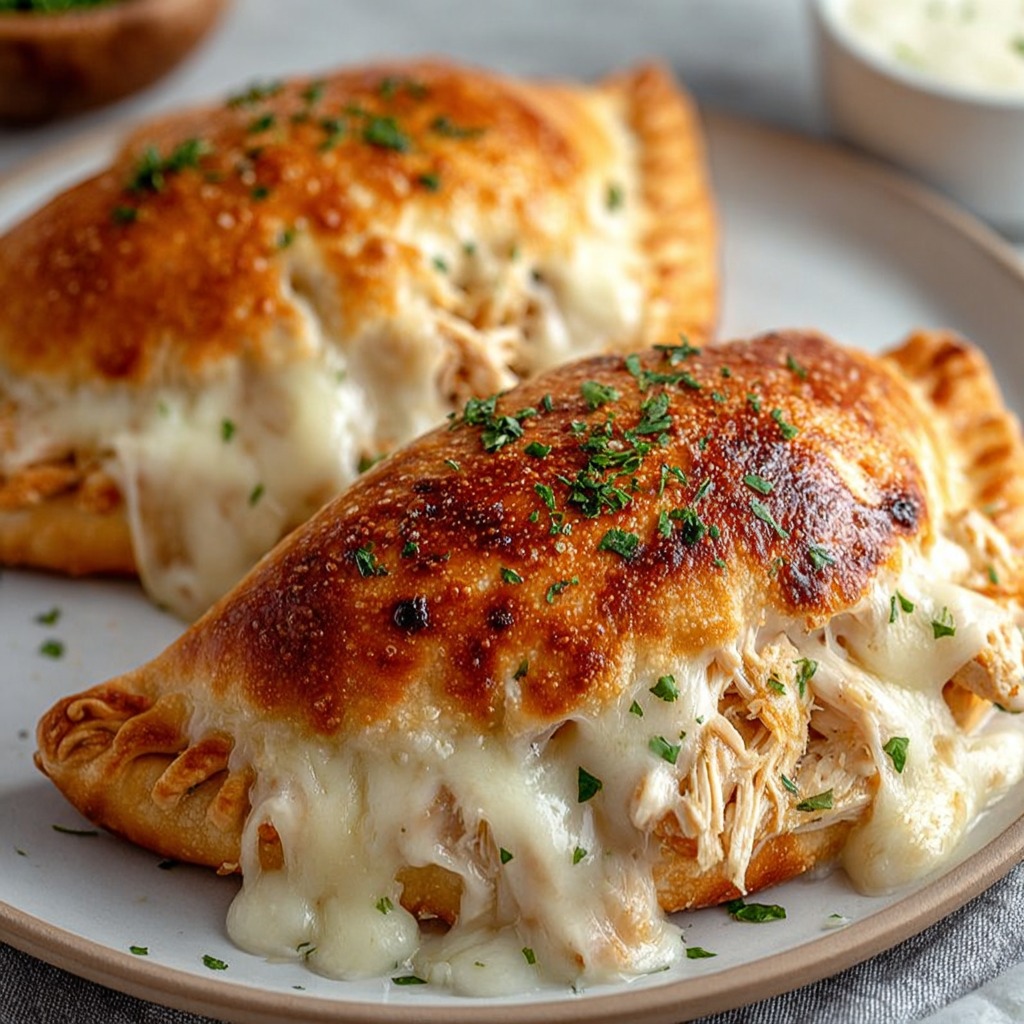 Laisser reposer les calzones quelques minutes avant de les couper. Servir chaudes, accompagnées d’un petit bol de sauce Alfredo supplémentaire pour tremper, ou d’une salade verte pour un repas complet. La pâte légère et croustillante contraste parfaitement avec le cœur fondant de fromage et de poulet tendre.