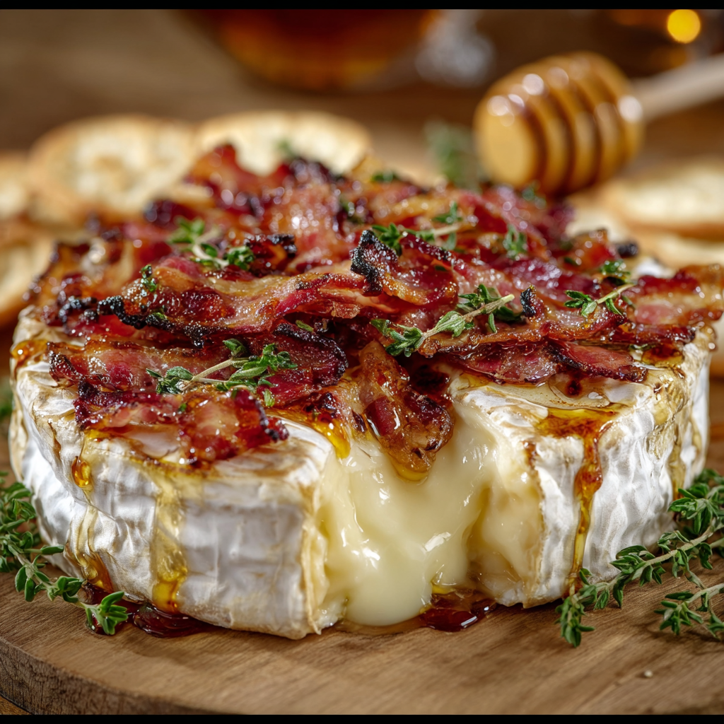 Le camembert rôti est une évolution moderne qui tire parti de sa texture fondante. L’idée de le combiner avec du bacon et du miel est née de la tendance actuelle à créer des plats sucrés-salés, qui mêlent le fondant et le croustillant, le doux et le salé. Ce mariage de saveurs rappelle les grandes tendances gastronomiques françaises, où l’on cherche toujours à surprendre le palais avec des associations audacieuses mais harmonieuses.