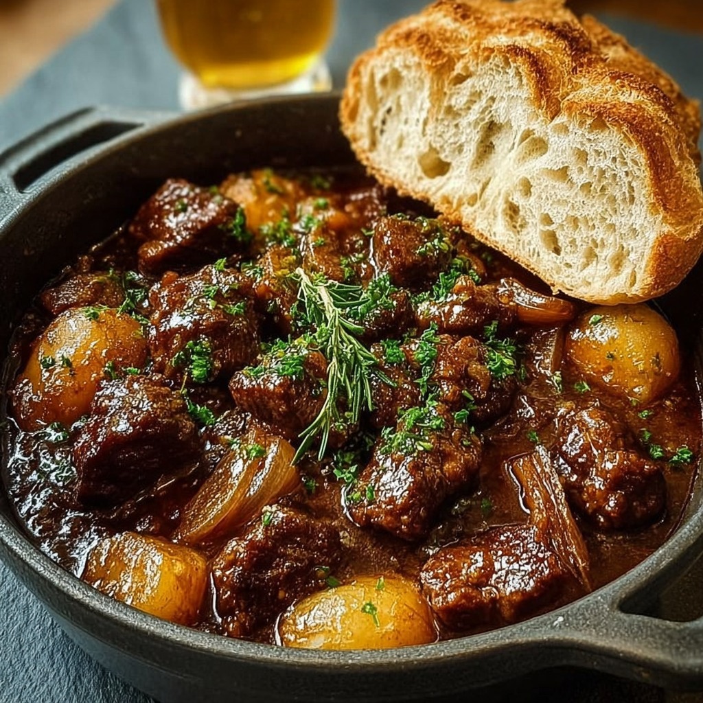 Ce plat est riche en protéines et en glucides, notamment si servi avec des frites ou des pommes de terre. La cuisson longue permet de conserver les nutriments de la viande et d’obtenir une sauce riche mais équilibrée. Les oignons apportent des fibres et des antioxydants naturels, tandis que la bière contribue à la profondeur aromatique sans excès de calories si utilisée avec modération.