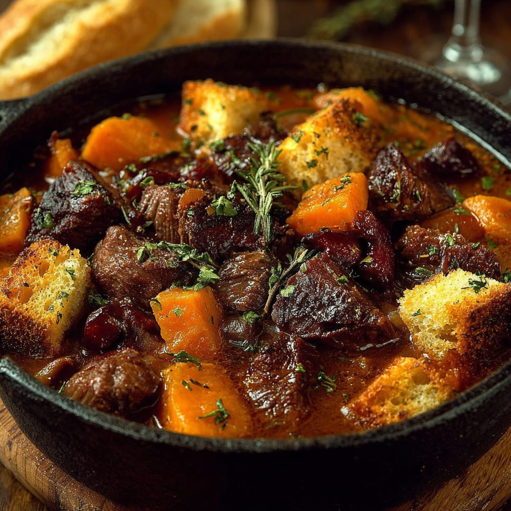 Cette version rustique de la carbonnade flamande apporte une touche chaleureuse et légèrement sucrée grâce à la patate douce et aux croûtons dorés. La bière brune parfume la sauce, les légumes fondent lentement, et la viande devient incroyablement tendre. Un plat réconfortant, généreux et plein de caractère, parfait pour les repas d’hiver ou les grandes tablées.