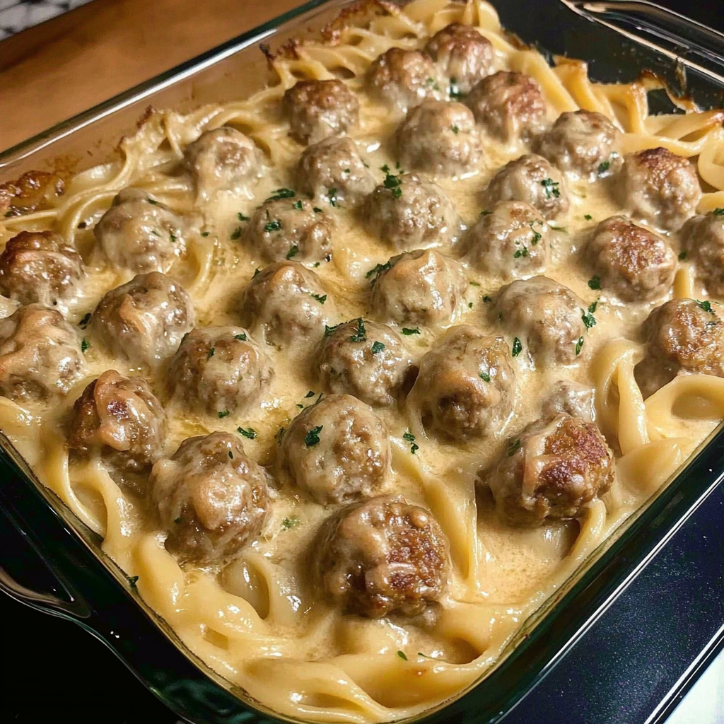 Boulettes juteuses et nouilles nappées d’une sauce crémeuse, gratinées au four pour un réconfort total.