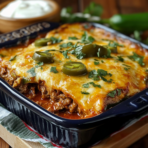 La Casserole de Chiles Rellenos au Bœuf est une variation moderne du célèbre plat mexicain, les chiles rellenos, traditionnellement composé de piments farcis de viande et de fromage. Dans cette version, les piments sont disposés en couches dans une casserole avec du bœuf assaisonné, des tomates épicées et une généreuse quantité de fromage fondu. Ce plat combine le piquant des piments poblanos, la richesse de la viande et la douceur du fromage, le tout cuit dans un four pour un résultat doré et savoureux.
