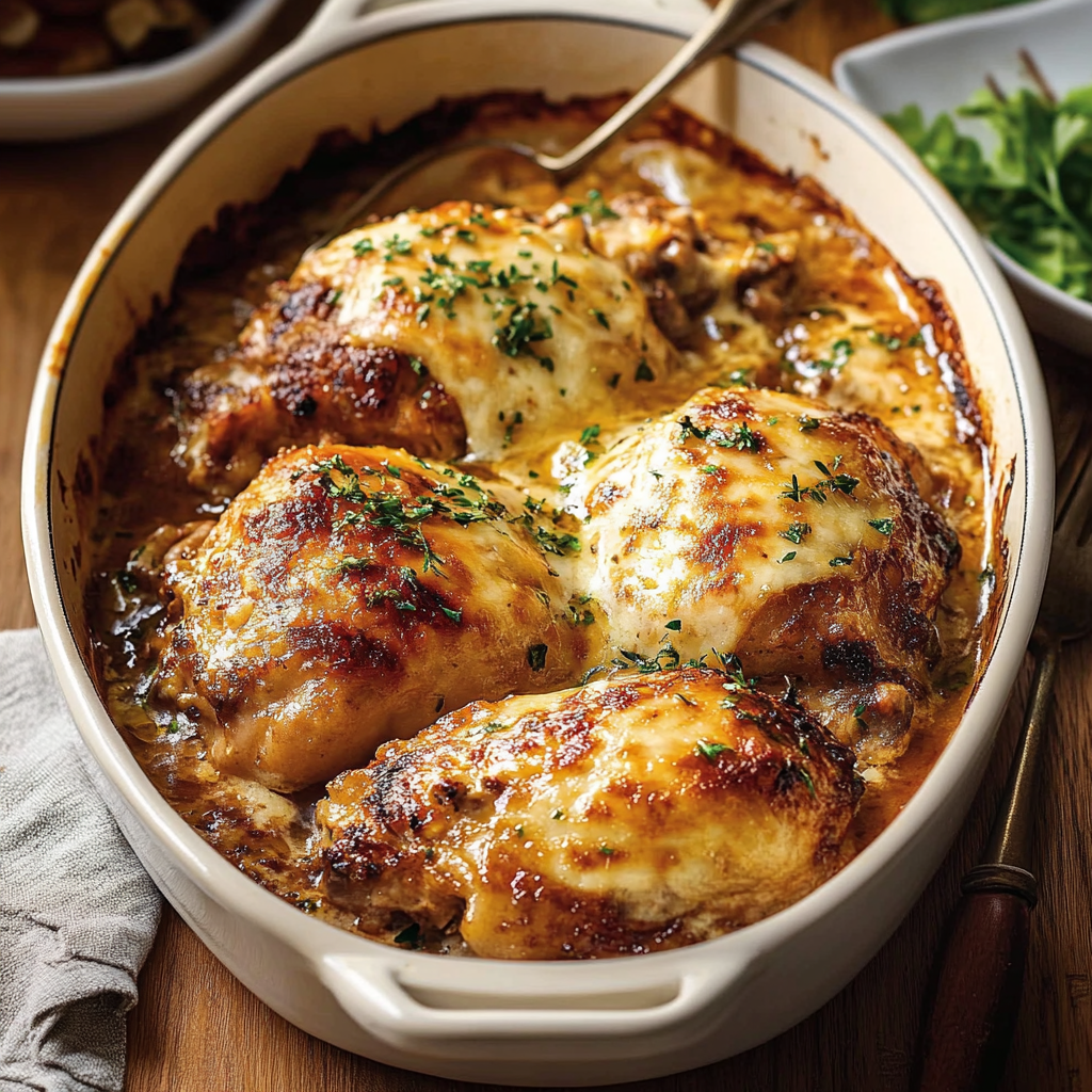 Cette casserole de poulet est non seulement savoureuse mais aussi très simple à préparer. Les oignons caramélisés ajoutent une douceur naturelle qui contraste avec la saveur riche et légèrement piquante du gruyère. De plus, le poulet est tendre et juteux grâce à la cuisson au four et à l’ajout de bouillon. C’est un plat qui réchauffe le cœur, parfait pour les soirées en famille ou pour impressionner vos invités sans trop d’efforts en cuisine.
