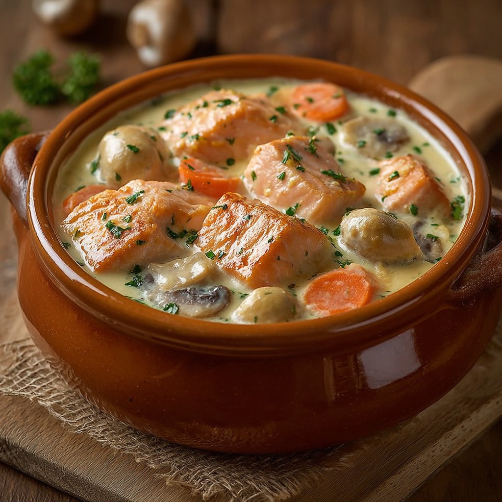 La cassolette de blanquette de saumon se sert chaude, décorée de persil frais haché pour apporter couleur et fraîcheur. Elle peut être accompagnée de riz blanc, de pommes de terre vapeur ou de pâtes pour un repas complet et équilibré.