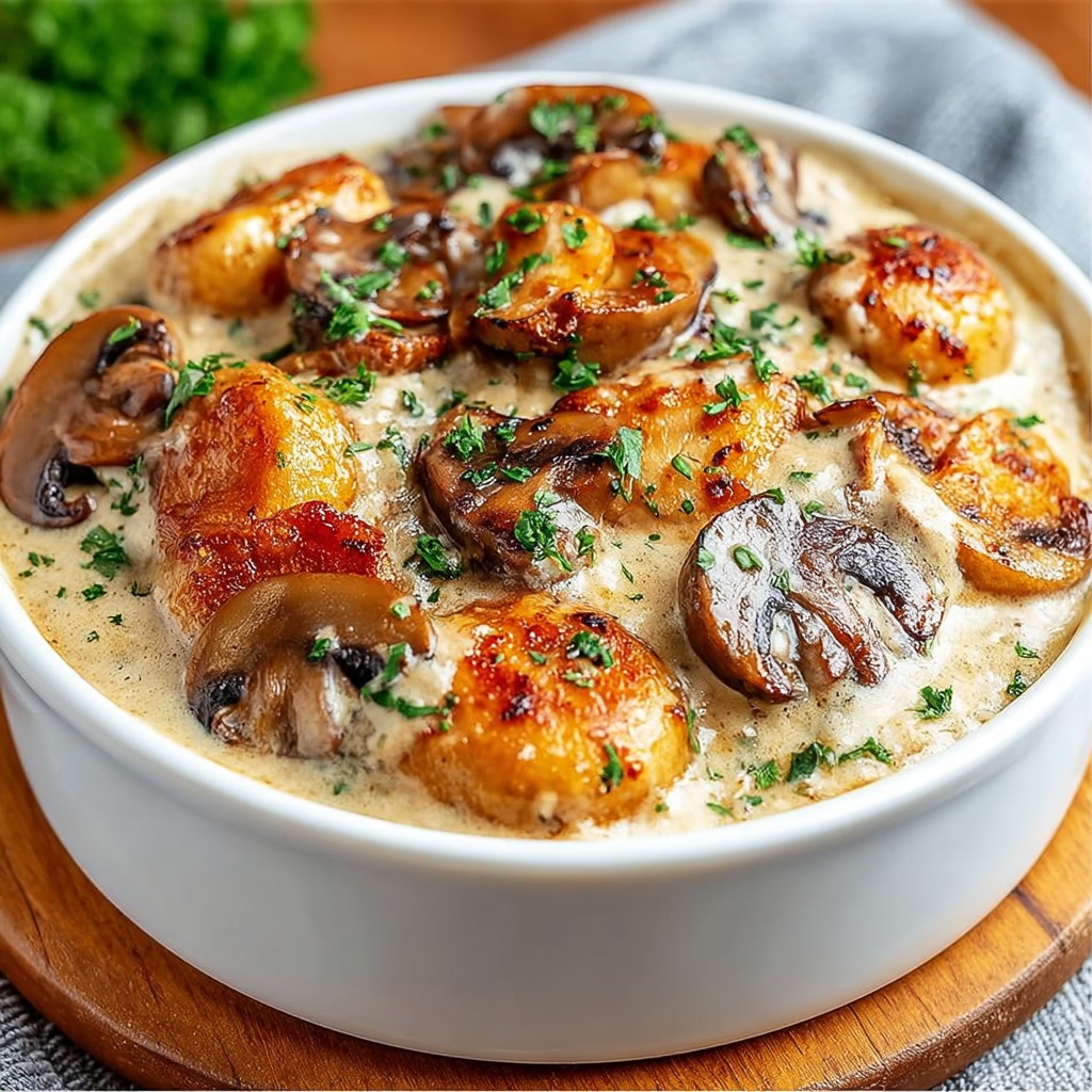 Avant le service, un peu de persil frais finement ciselé et quelques noisettes concassées peuvent être ajoutés pour apporter couleur, parfum et texture. La cassolette est servie chaude pour profiter pleinement de la sauce crémeuse et des champignons fondants.