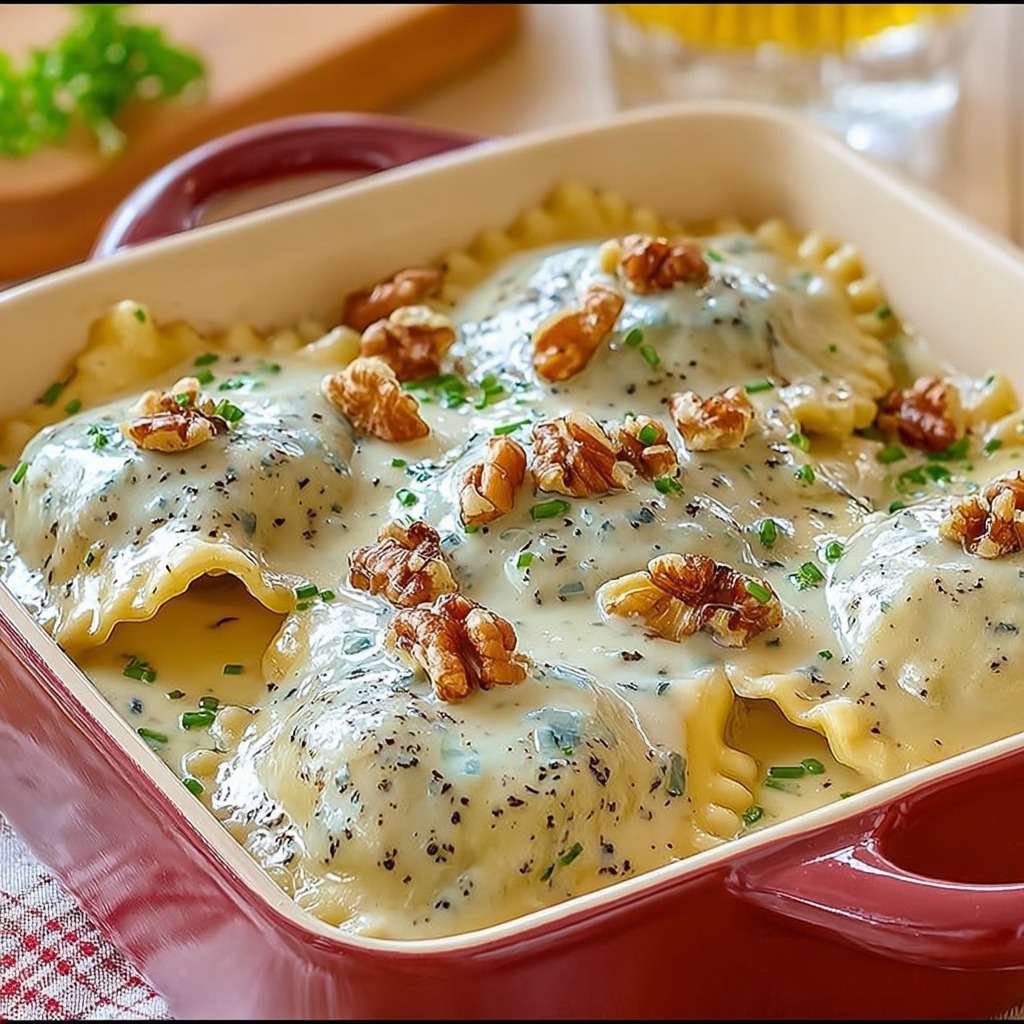 Cette cassolette de ravioles au bleu et noix offre un mariage savoureux de textures et de parfums, où la douceur crémeuse rencontre le caractère du fromage bleu et le croquant des noix dan
