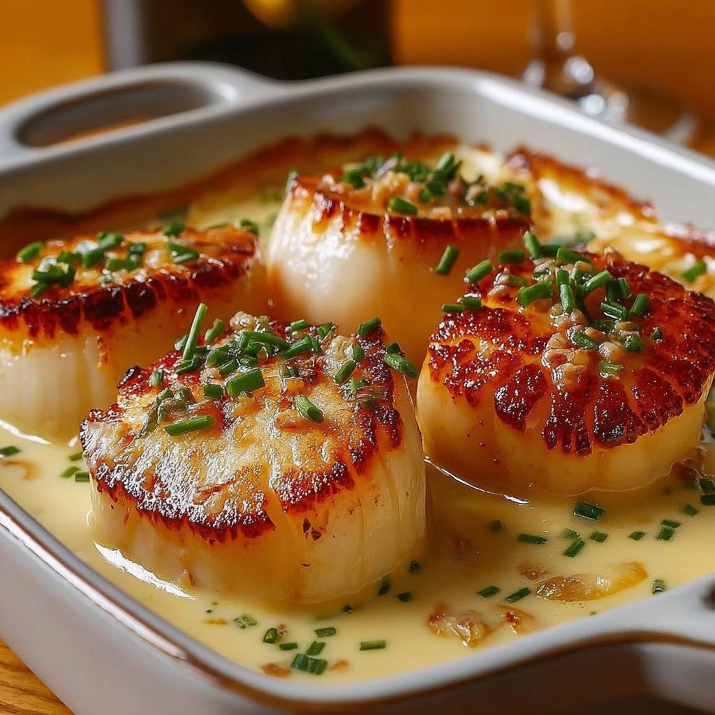 Les Saint-Jacques sont riches en protéines maigres et en minéraux tels que le zinc et le sélénium. Le Champagne et la crème apportent des arômes et une texture onctueuse tout en restant modérés en quantité. Servi avec un accompagnement léger comme des légumes vapeur ou du riz, ce plat constitue un repas équilibré, raffiné et savoureux, idéal pour les occasions spéciales ou les repas gourmands.