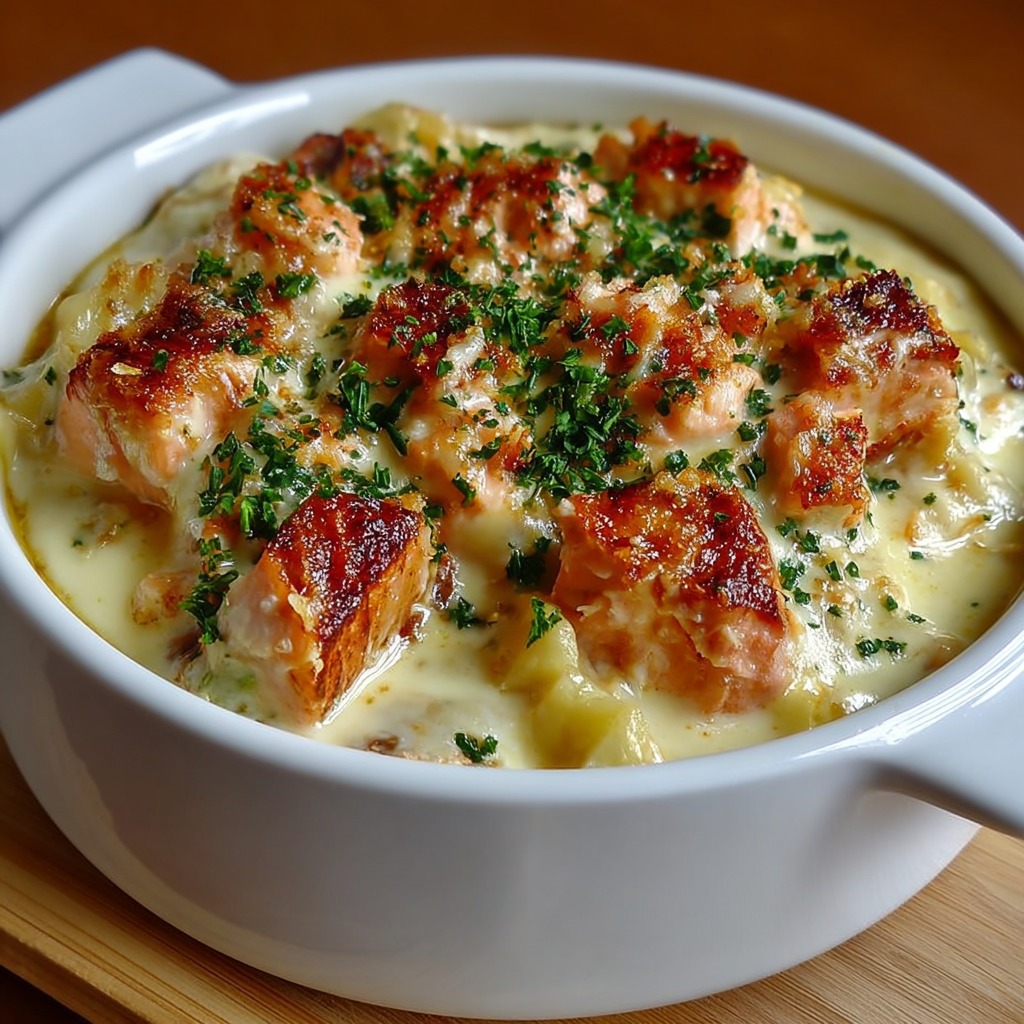 Avant le service, la ciboulette est ajoutée pour la couleur et la fraîcheur. La cassolette est servie chaude pour profiter pleinement de la sauce crémeuse et du thon fondant.