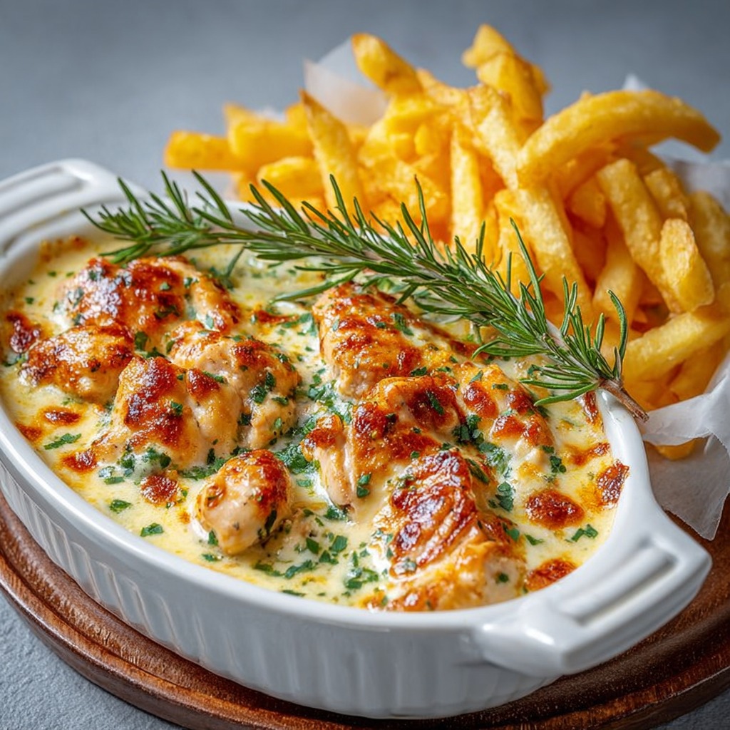 Pour un goût optimal, choisir un Maroilles de qualité et bien affiné. Ne pas surcuire le poulet pour qu’il reste tendre et juteux. Pour plus de saveur, laisser reposer le poulet quelques minutes dans la sauce avant d’enfourner. Les frites peuvent être préparées à l’avance et réchauffées légèrement au four pour gagner du temps.