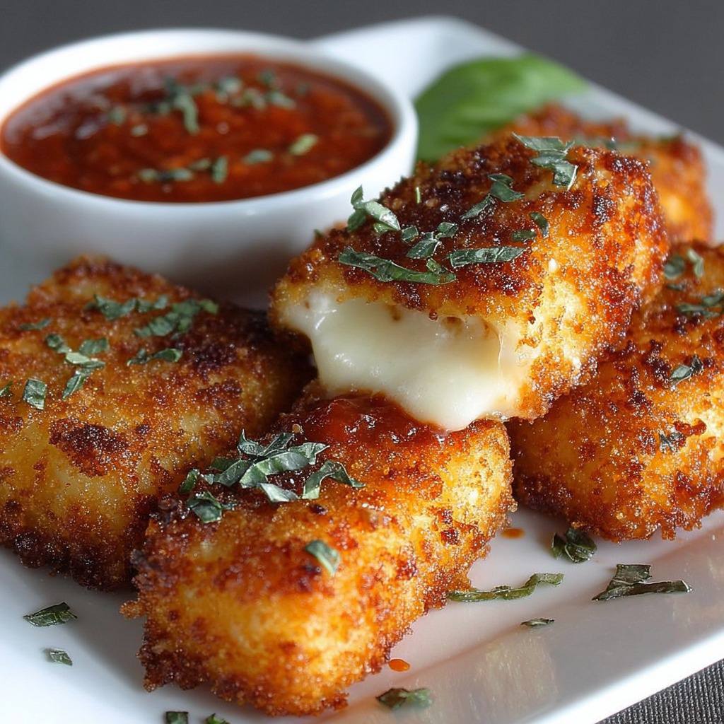 Ces bouchées de mozzarella frites sont dorées et croustillantes.