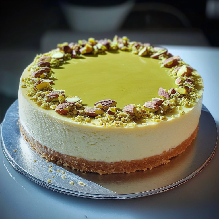 Laissez-vous guider à travers cette recette complète, qui vous expliquera pas à pas comment réaliser ce cheesecake à la pistache ultra-crémeux, avec une base croustillante, une garniture fondante et un nappage subtilement coloré.