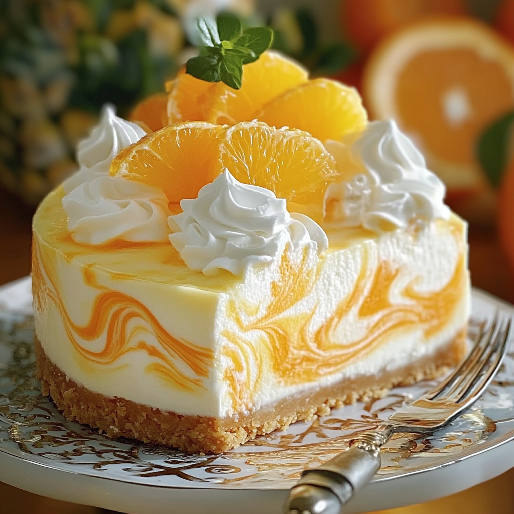 Un cheesecake tropical rafraîchissant avec un tourbillon d’ananas et d’orange pour égayer vos papilles !