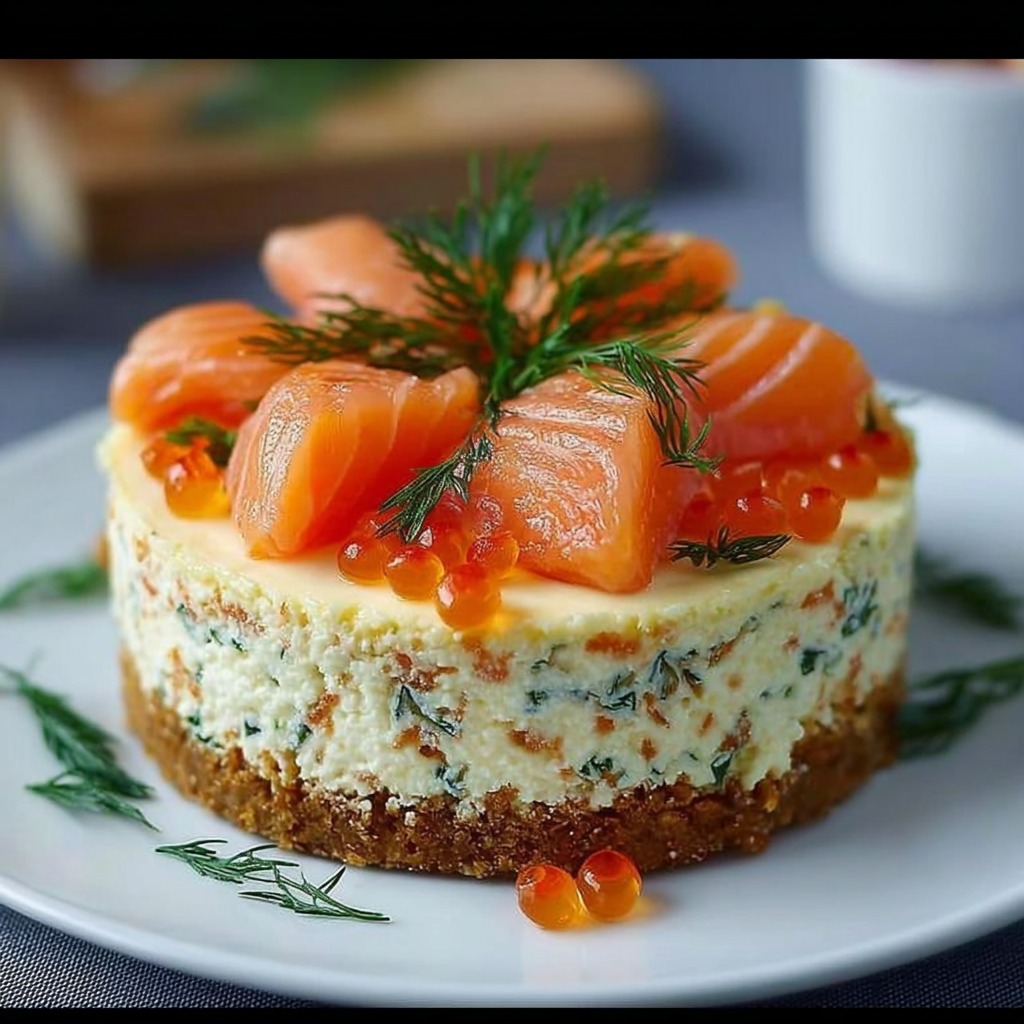 Le cheesecake se sert frais, tranché en parts régulières. Il peut être décoré avec des lamelles de saumon fumé, des brins d’aneth et de la ciboulette pour renforcer l’aspect visuel et aromatique. Il constitue une entrée élégante ou une pièce maîtresse d’un buffet apéritif.