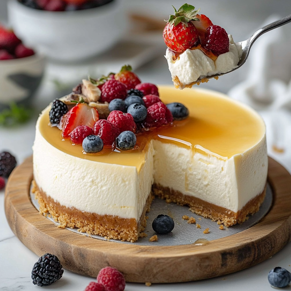 Démouler le cheesecake : Une fois que le cheesecake a bien pris, démoulez-le délicatement. Vous pouvez le garnir de fruits frais, de coulis de fruits rouges ou d’un peu de miel pour une touche sucrée supplémentaire.