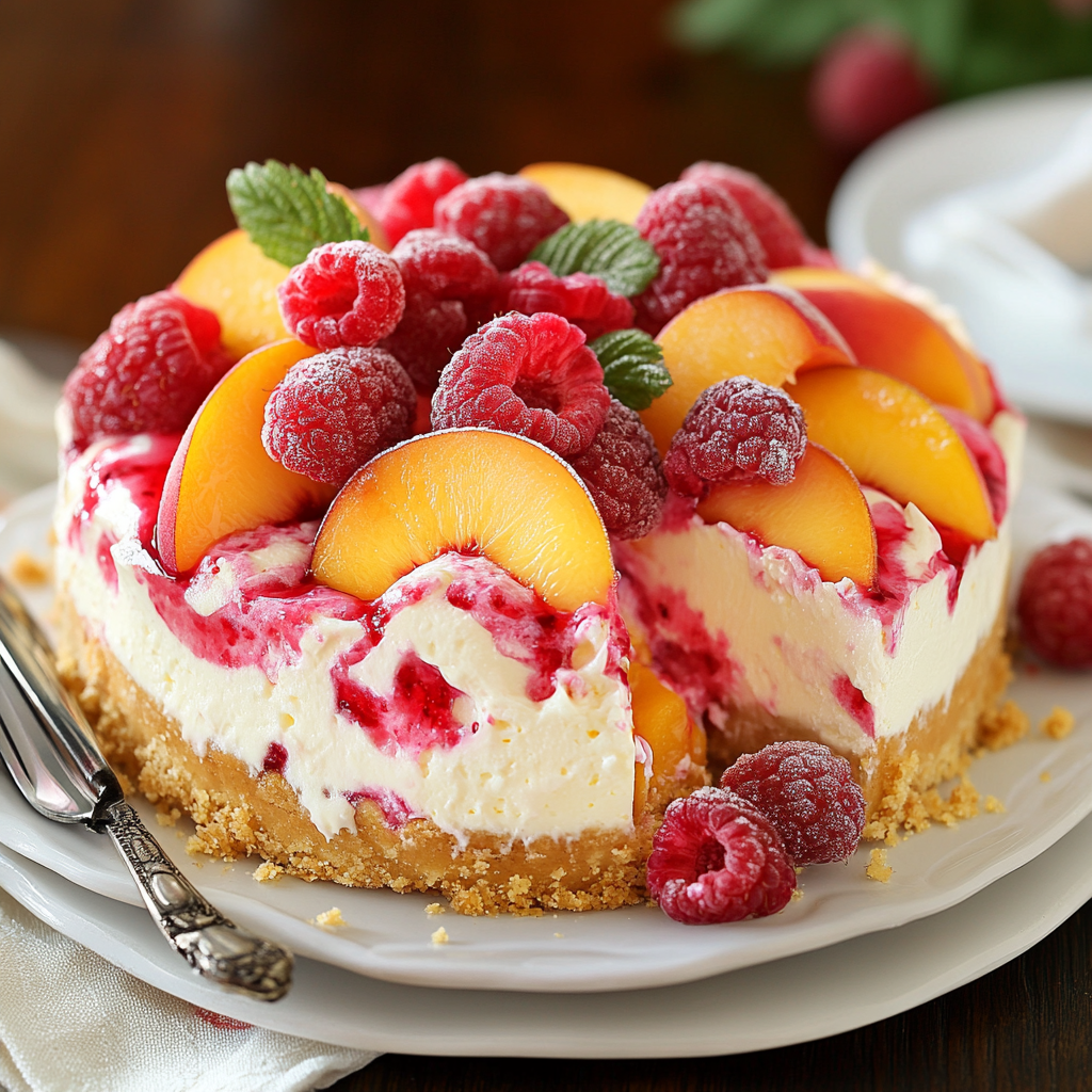 Un cheesecake sans cuisson aux pêches et framboises, parfait pour l’été!