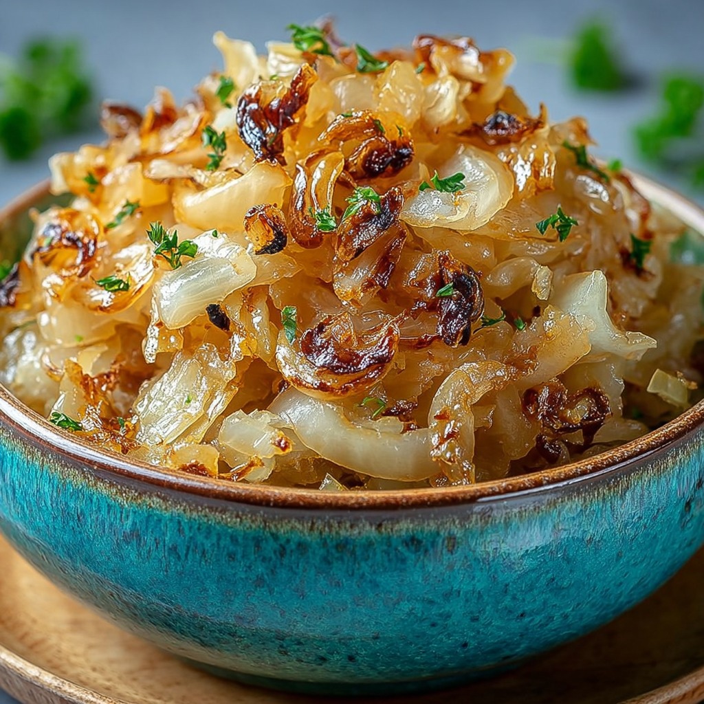 Pour la finition, parsemez d’herbes fraîches hachées comme le persil, la ciboulette ou la coriandre. Elles ajoutent non seulement une touche de couleur mais aussi un parfum frais qui contraste avec la douceur caramélisée du chou et des oignons.