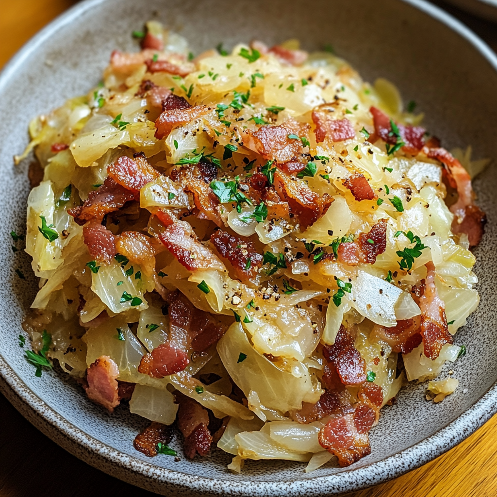 Le chou est un légume très apprécié dans diverses cuisines du monde. Riche en fibres et en vitamines, il est non seulement nutritif, mais aussi très polyvalent. Dans cette recette, le chou est associé à du bacon croustillant, des oignons doux et de l’ail parfumé pour créer un mélange irrésistible. Ce type de recette est populaire dans les cuisines rustiques, notamment en Europe de l’Est, où le chou est un ingrédient de base, mais aussi dans le sud des États-Unis où le bacon et le chou sont souvent cuisinés ensemble.