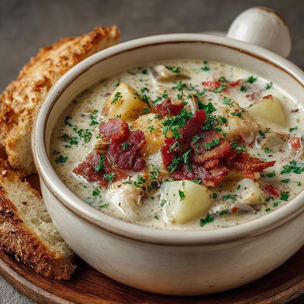 Servez le chowder bien chaud dans des bols profonds, garni de persil frais haché. Il peut être accompagné de crackers salés, de pain de maïs ou de tranches de pain grillé. Sa texture crémeuse et ses saveurs marines en font un plat idéal pour les repas d’hiver ou pour impressionner des invités avec une spécialité américaine authentique.