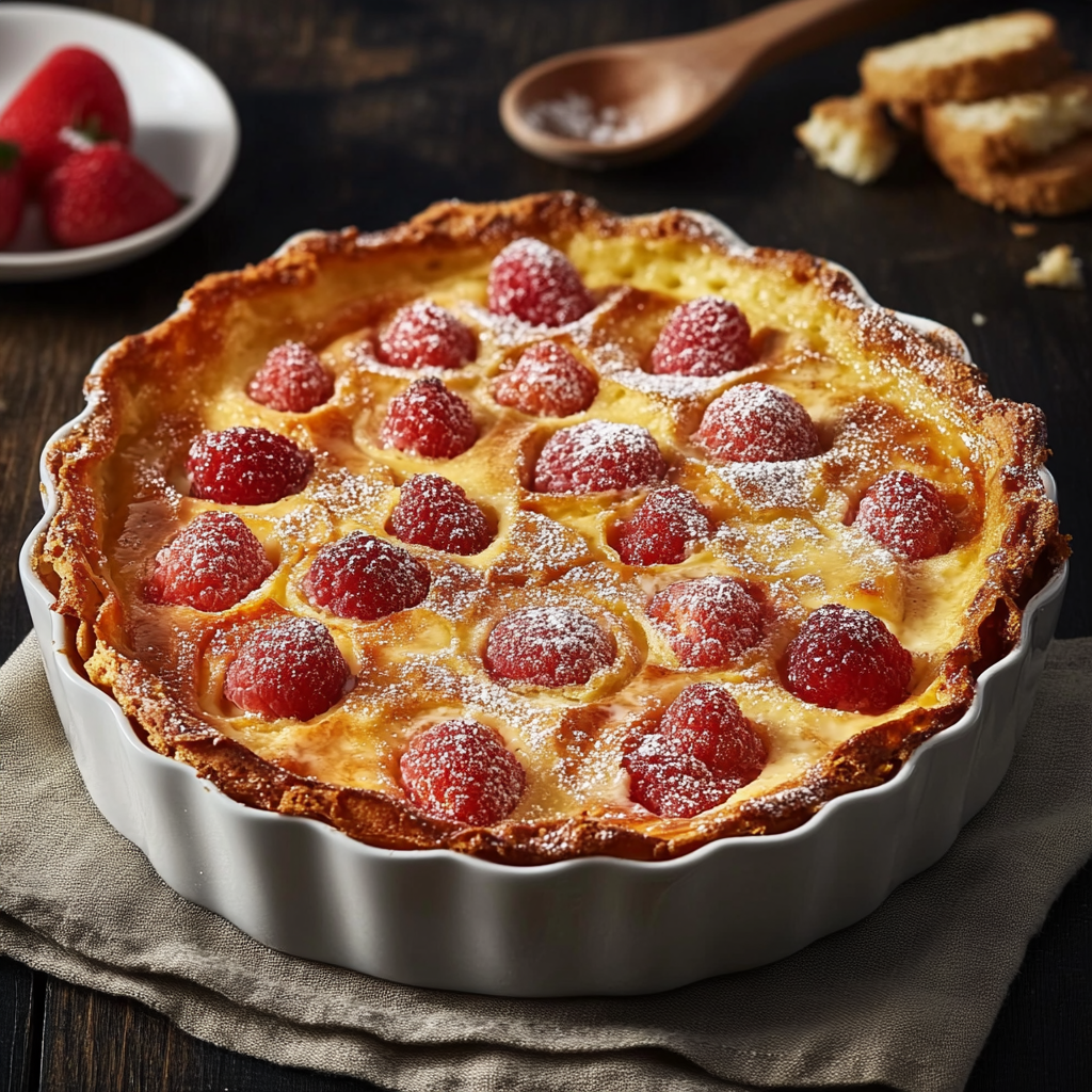 Le clafoutis est originaire de la région du Limousin, en France. Traditionnellement, il est préparé avec des cerises noires, mais avec le temps, d’autres fruits comme les fraises, les pêches ou les abricots ont gagné en popularité. La particularité de ce dessert réside dans sa texture unique, à mi-chemin entre le flan et le gâteau.