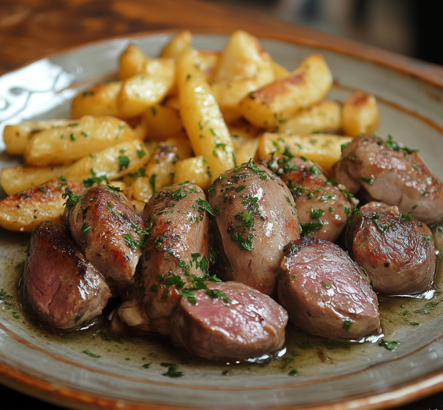 Coeurs de canard tendres, sautés à la perfection avec ail, persil et vinaigre, explosion de saveurs.