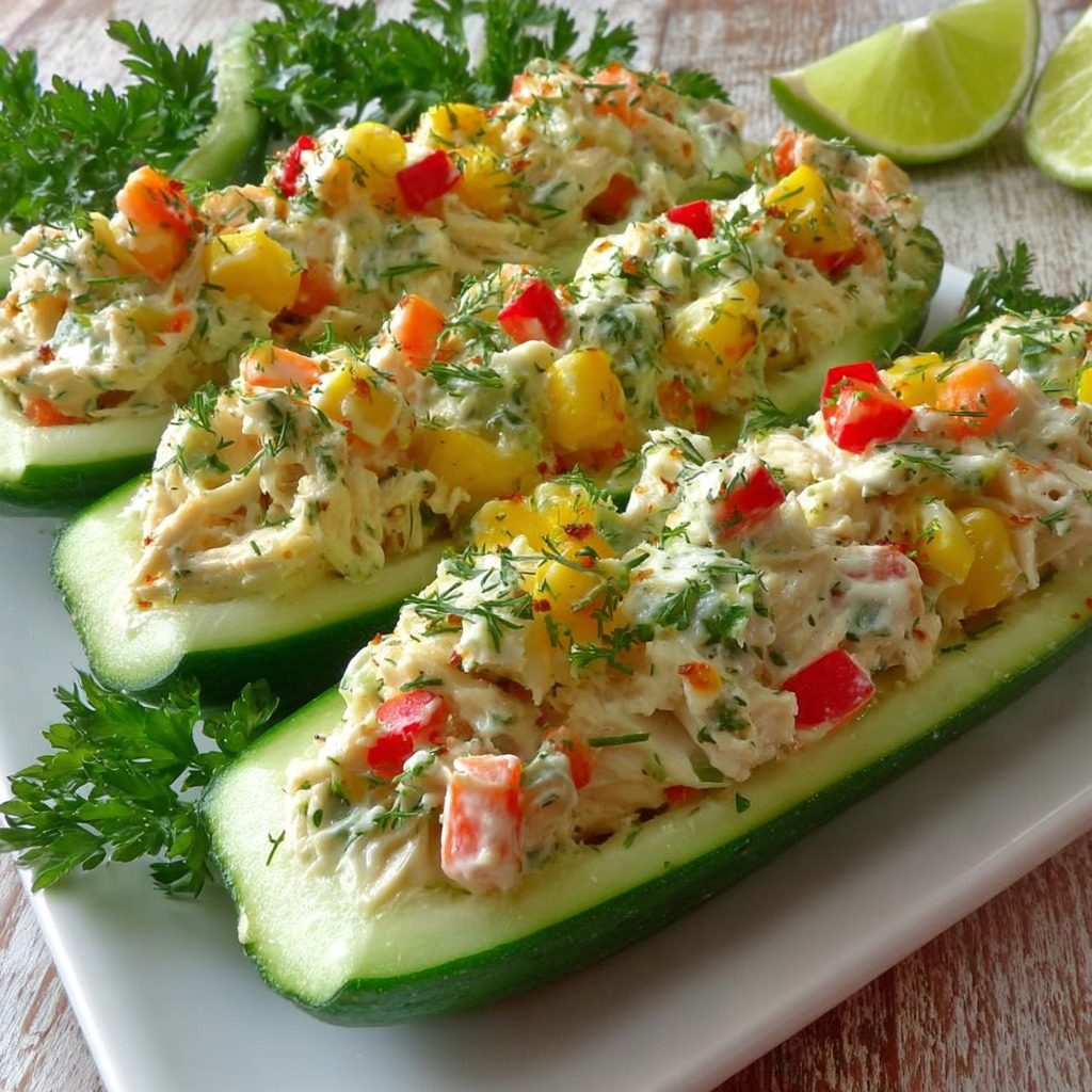 Les concombres farcis au poulet croquant se servent idéalement frais mais avec un poulet encore légèrement tiède pour accentuer le contraste thermique. Ils peuvent être présentés alignés sur un plat ou disposés individuellement. Ce plat se prête bien aux repas estivaux aux buffets ou aux entrées raffinées grâce à son aspect moderne et équilibré.