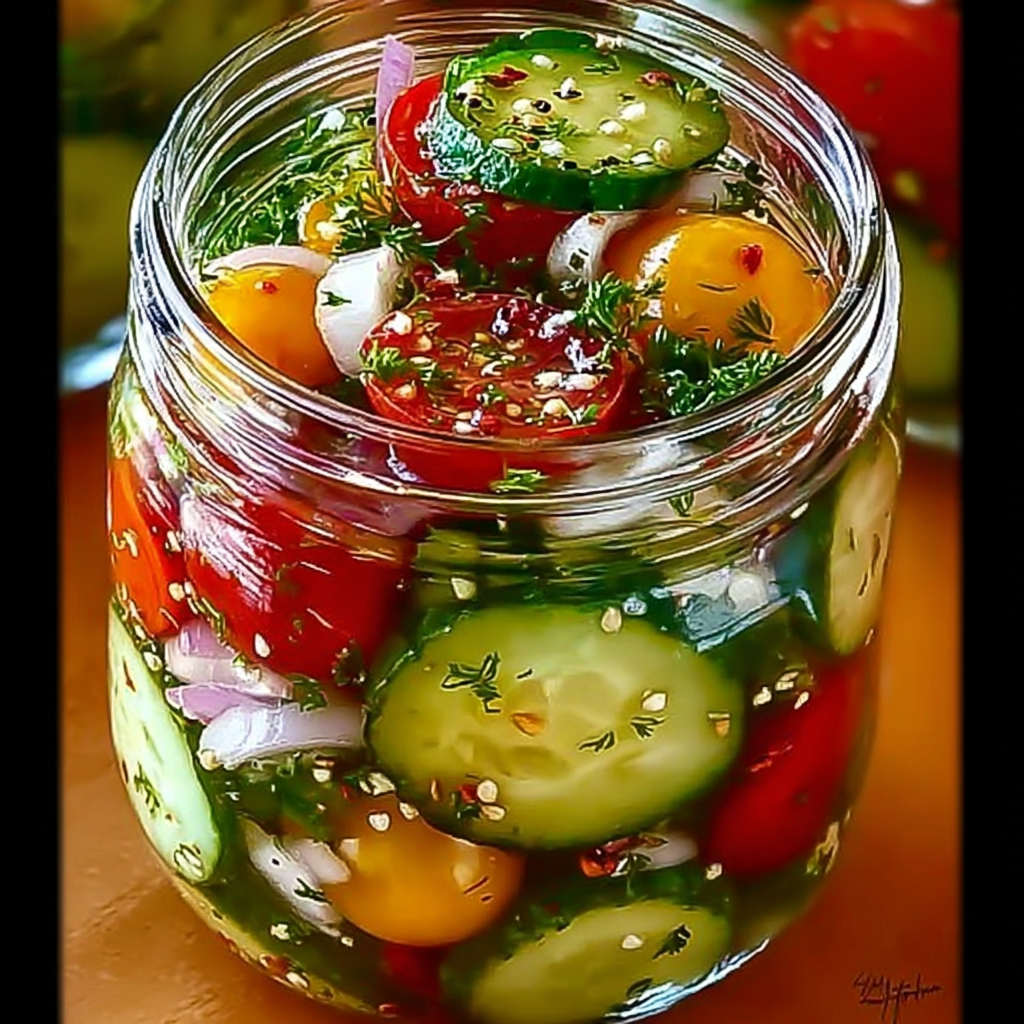 Un accompagnement frais et acidulé qui ravira vos repas d’été ou toute occasion où vous souhaitez apporter une touche légère et vitaminée. Facile à préparer, ce mélange mariné combine la douceur des tomates, le croquant des concombres et la légère piquante des oignons, relevé par une marinade acidulée et aromatique.