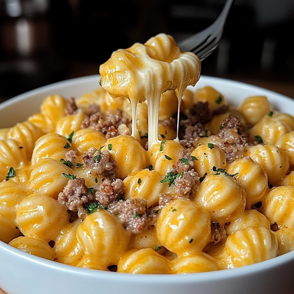 Ajoutez le lait, le fromage râpé, et le fromage à la crème dans la poêle avec le bœuf. Mélangez bien jusqu’à ce que les fromages fondent et que la sauce devienne onctueuse.