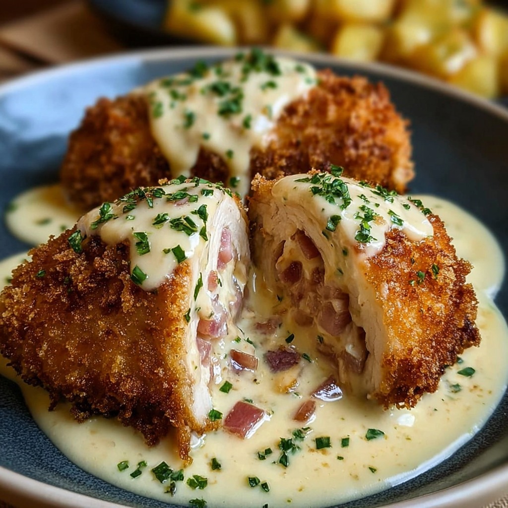 Le cordon bleu de poulet crémeux est un plat généreux et élégant qui combine croustillant, fondant et saveur. Chaque bouchée révèle le contraste entre la panure dorée, le poulet tendre et la garniture fondante, pour une