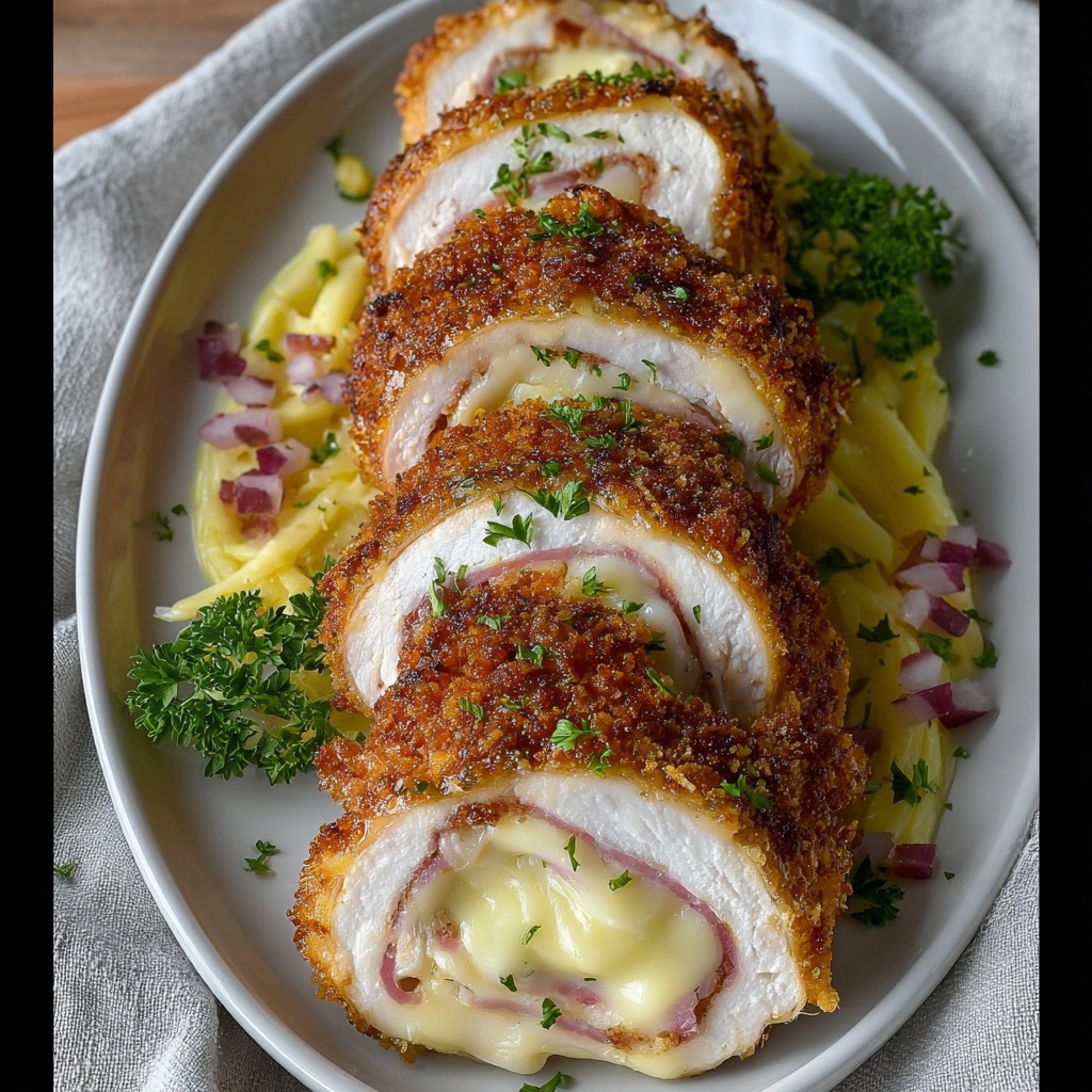 Une fois cuits, les cordons bleus présentent une panure dorée et croustillante à l’extérieur, tandis que le jambon et le fromage à l’intérieur créent un cœur fondant et savoureux. La viande reste tendre et juteuse grâce à une cuisson maîtrisée. L’équilibre entre croustillant et fondant est la clé de la réussite de ce plat.