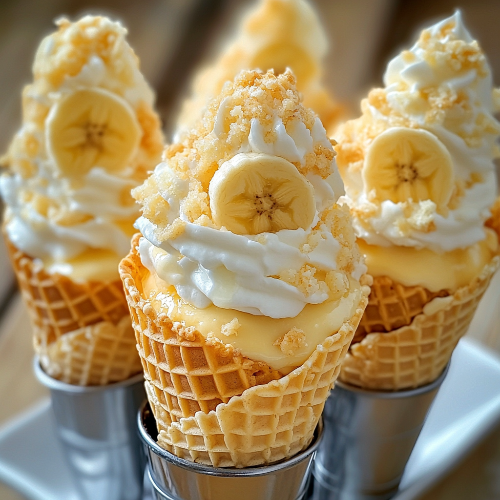 - Garnir et servir : Garnissez chaque cornet d’une tranche de banane, d’une cuillerée de crème fouettée, et de biscuits écrasés. Pour les plus gourmands, un filet de caramel ajoutera une touche sucrée supplémentaire.