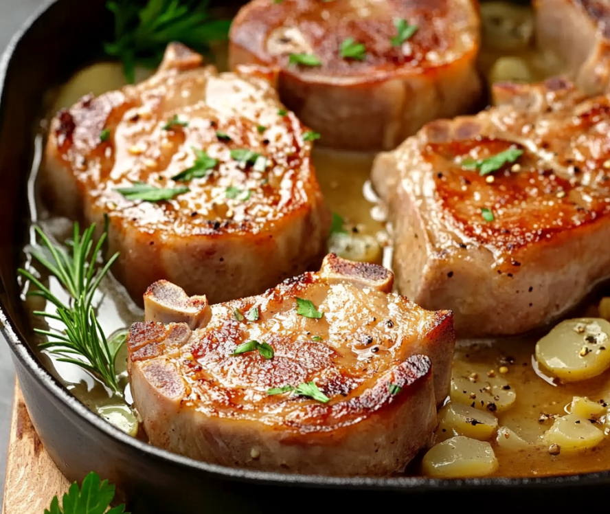 Savourez ces côtelettes de porc dorées, nappées d’une sauce riche en herbes et miel, pour un repas chaleureux.
