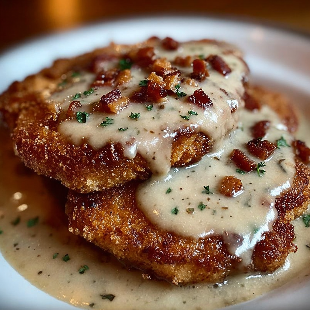 Ce plat est inspiré de la cuisine du sud des États-Unis, où le “Country Fried Pork” est un classique. Ici, on l’élève d’un cran en y ajoutant une sauce crémeuse au bacon qui fait toute la différence.