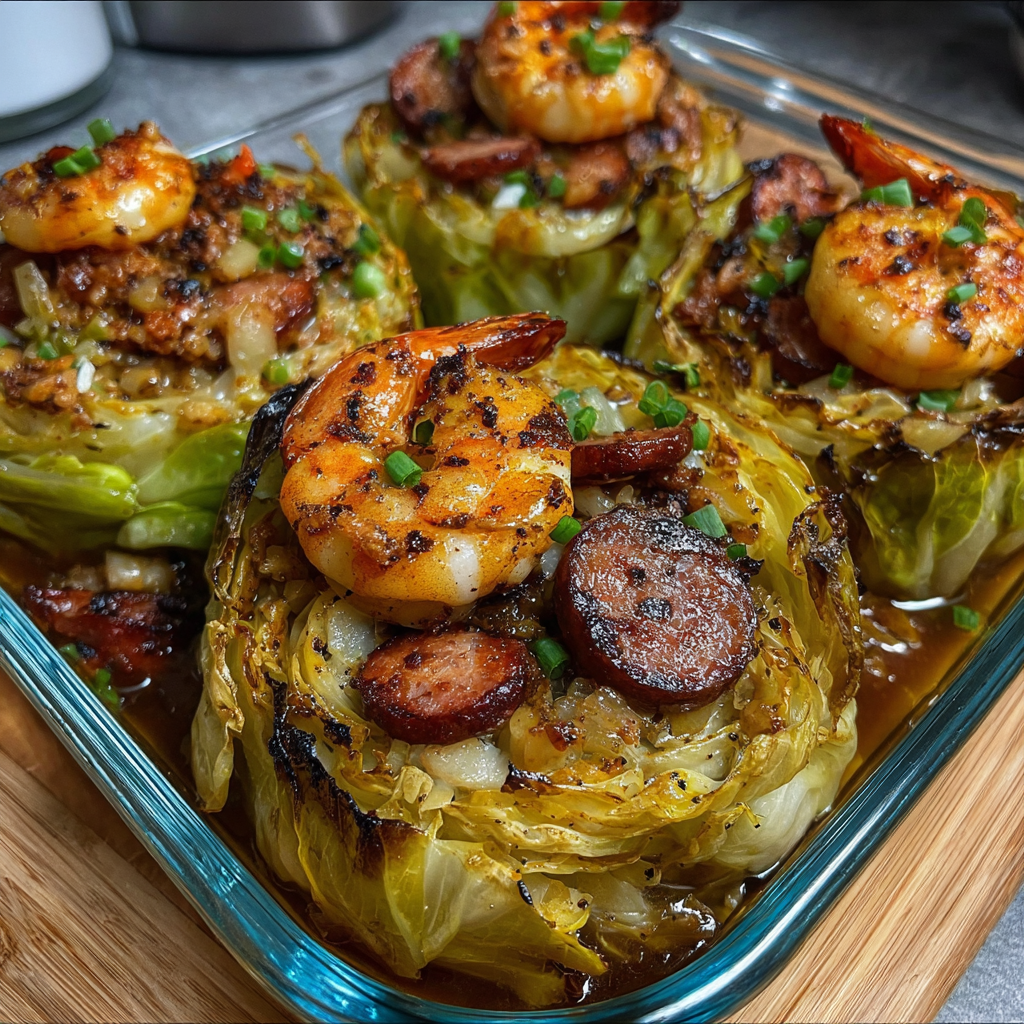 Audacieuses, parfumées et naturellement pauvres en glucides, ces coupelles de chou garnies aux crevettes à l’ail et saucisses sont une idée de repas aussi délicieuse qu’originale. Des feuilles de chou légèrement rôties deviennent des “coupelles” croustillantes et fondantes à la fois, remplies d’une garniture généreuse de crevettes juteuses, de saucisses fumées et de légumes tendres.
