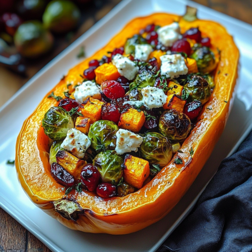 La courge butternut rôtie farcie aux légumes d’automne et fromage de chèvre est un plat festif et coloré, parfait pour les repas de saison. Avec ses légumes rôtis, ses cranberries acidulées et son fromage de chèvre crémeux, il offre un équilibre parfait entre douceur, fraîcheur et profondeur de saveurs. Que vous le serviez en plat principal ou en accompagnement d’un rôti, ce plat saura apporter une touche automnale à votre table.