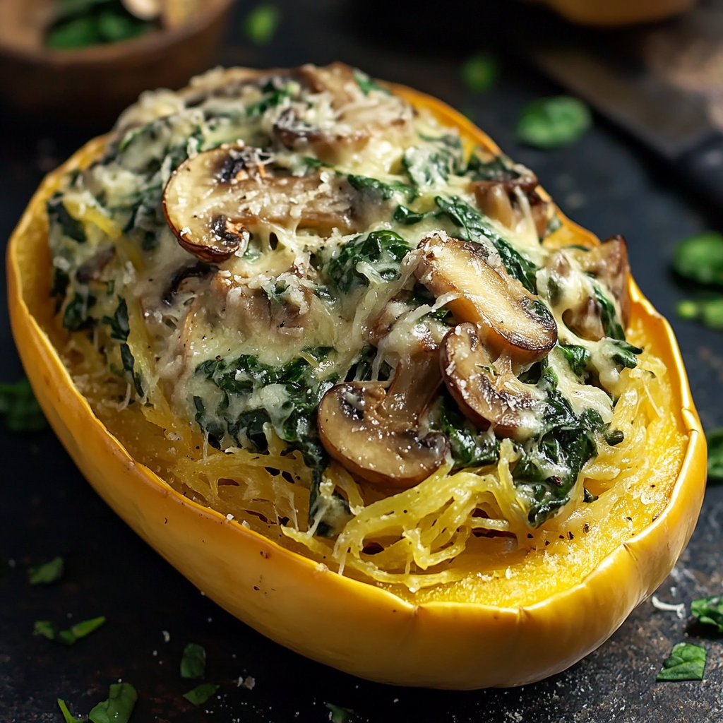Un plat savoureux de courge spaghetti farcie avec une garniture crémeuse aux épinards et champignons.