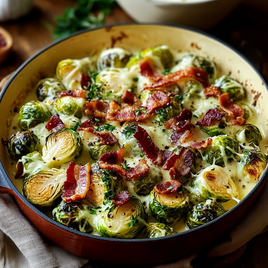 These Creamy Garlic Parmesan Brussels Sprouts with Bacon are a rich and flavorful side dish, perfect for pairing with grilled chicken or steak. The dish features Brussels sprouts sautéed to golden perfection, then coated in a creamy garlic Parmesan sauce and topped with crispy turkey bacon.