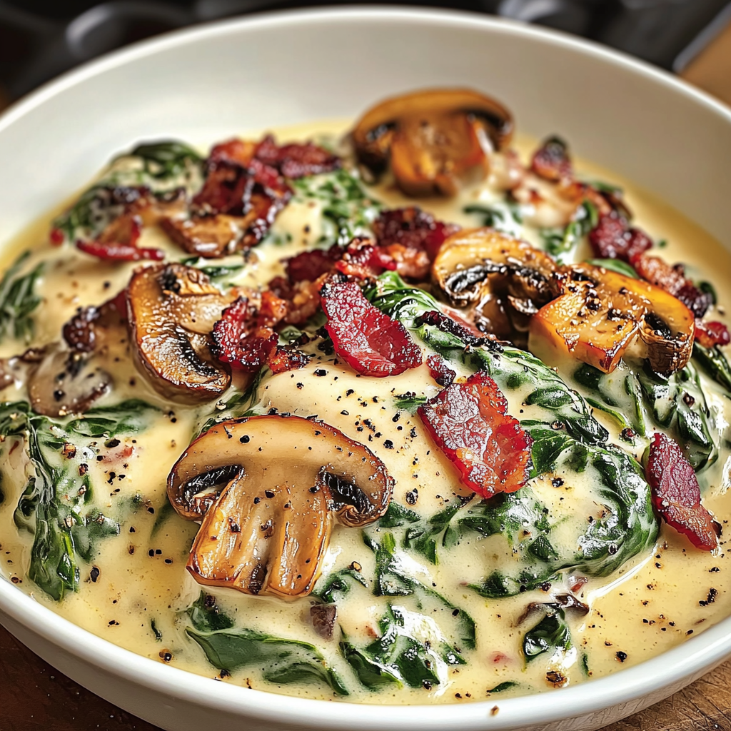 Rien de tel qu’une savoureuse crème d’épinards avec du bacon croustillant et des champignons pour un accompagnement gourmand qui complétera parfaitement vos repas. Ce plat crémeux et réconfortant est idéal pour accompagner des viandes, des pâtes, ou même en garniture de riz.