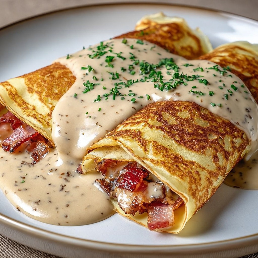 Les crêpes au poulet, bacon et béchamel se dégustent chaudes, directement à la sortie du four. Elles peuvent être servies accompagnées d’une salade verte légèrement vinaigrée pour apporter une touche de fraîcheur. Ce contraste entre la richesse du plat et la légèreté de la salade crée un équilibre agréable. Pour une présentation élégante, on peut parsemer un peu de persil haché sur le dessus des crêpes avant de servir. Elles sont également délicieuses réchauffées le lendemain, car les saveurs ont eu le temps de se développer.