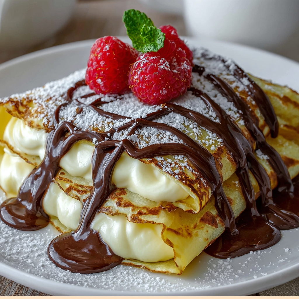 Étalez une généreuse couche de crème pâtissière sur chaque crêpe. Roulez ou pliez les crêpes selon votre préférence. Disposez-les sur une assiette de service et nappez de ganache au chocolat. Laissez légèrement figer avant de servir pour un dessert plus net et gourmand.