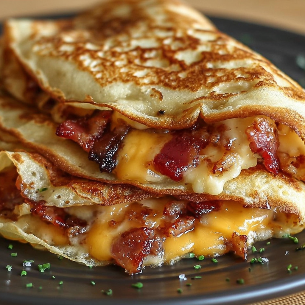 Un plat simple et gourmand, idéal pour un brunch, un déjeuner rapide ou un dîner convivial. Le bacon croustillant se marie parfaitement au cheddar fondant, enfermé dans des crêpes souples et dorées.