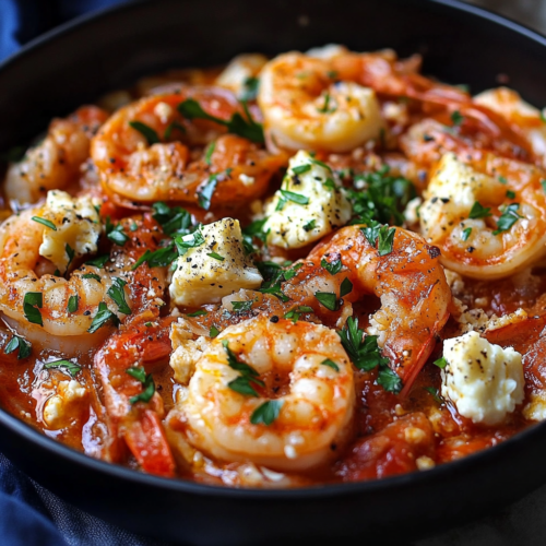 Réduisez le feu et répartissez la feta émiettée sur le mélange de crevettes et de tomates. Couvrez la poêle et laissez mijoter encore 2 minutes. La feta doit fondre légèrement et se mélanger à la sauce, créant une texture crémeuse et savoureuse.