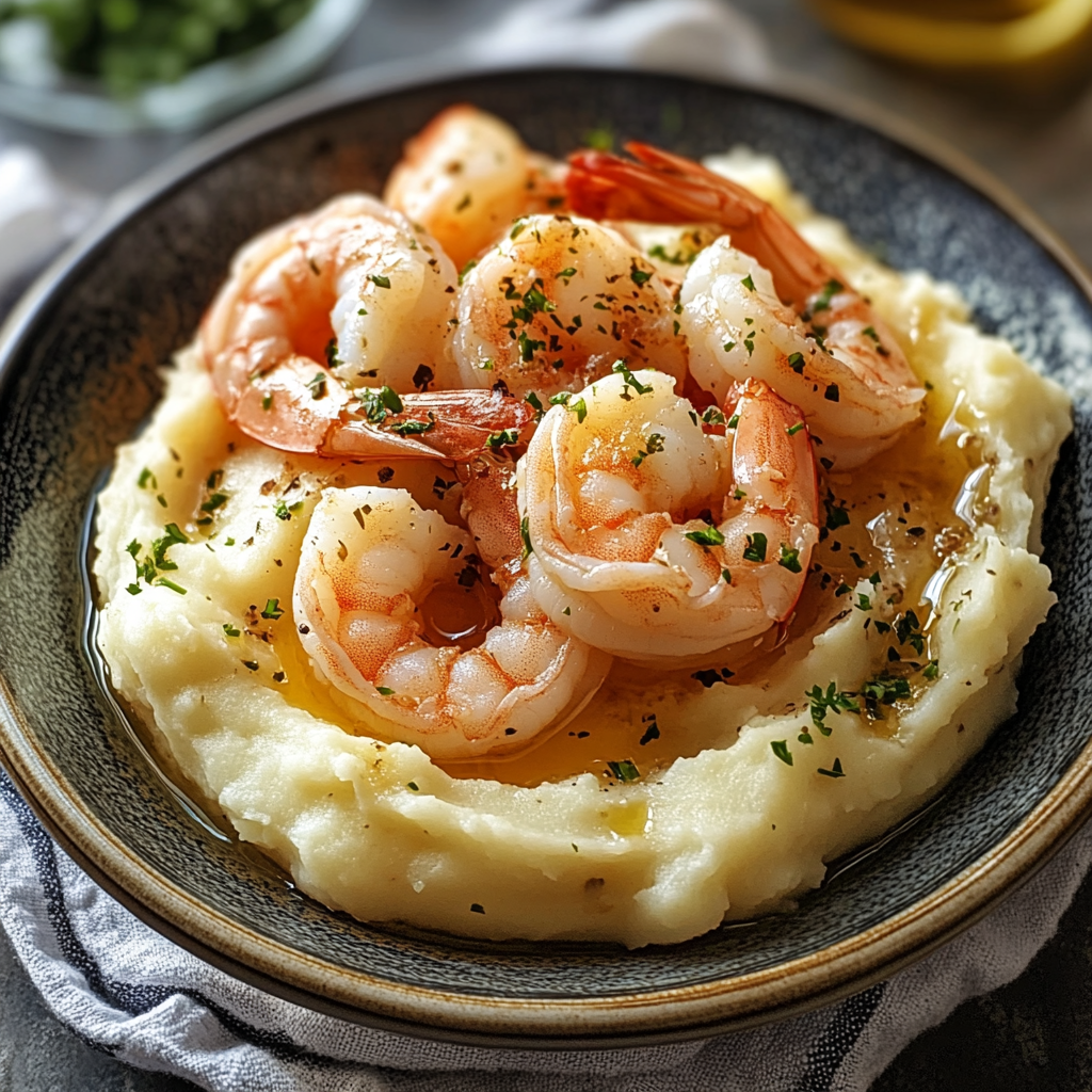 Un plat délicieux alliant crevettes savoureuses et purée de pommes de terre crémeuse, parfait pour un dîner raffiné !