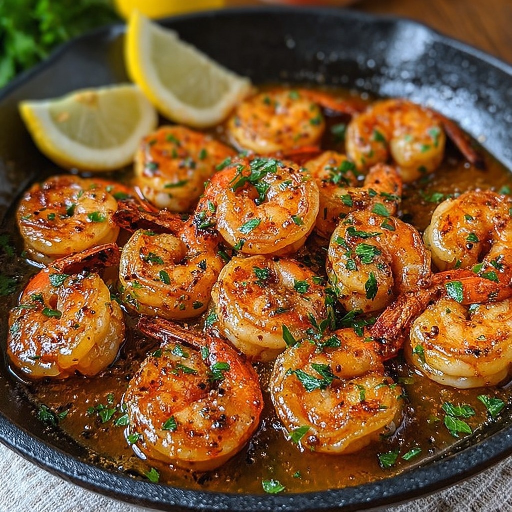 Pour la présentation, disposer les crevettes dans une assiette creuse, arroser généreusement de sauce et parsemer de persil frais. Ajouter quelques tranches fines de citron sur le bord de l’assiette pour la décoration et un peu de paprika fumé en surface pour accentuer la couleur. Servi ainsi, le plat attire immédiatement le regard grâce à sa teinte ambrée et sa brillance.