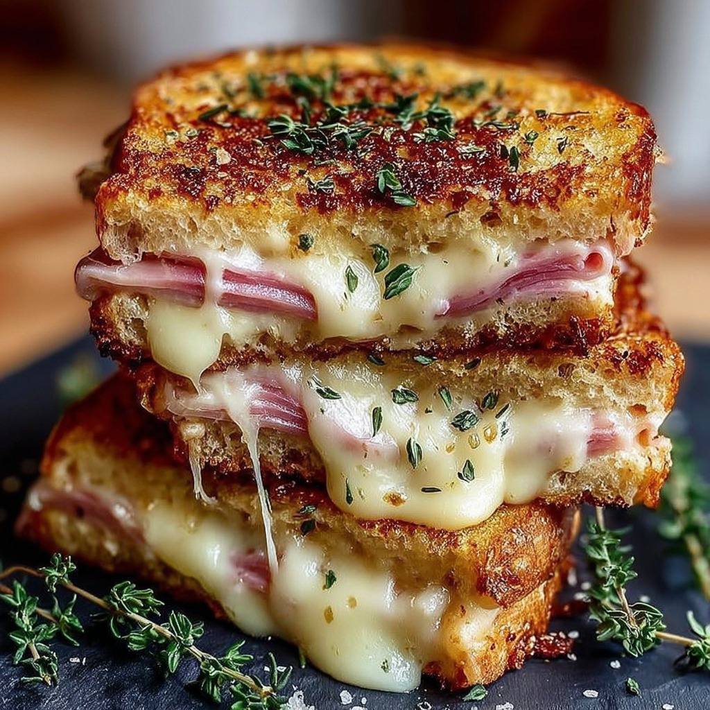 Une fois les croques cuits, sortez-les de la poêle et laissez-les reposer une minute. Coupez chaque croque en deux à l’aide d’un couteau à lame fine et tranchante. Disposez-les sur une assiette chaude ou une planche. Parsemez quelques feuilles de thym frais sur le dessus. Le thym apporte fraîcheur et une note aromatique intéressante en contraste avec le fromage fondu.