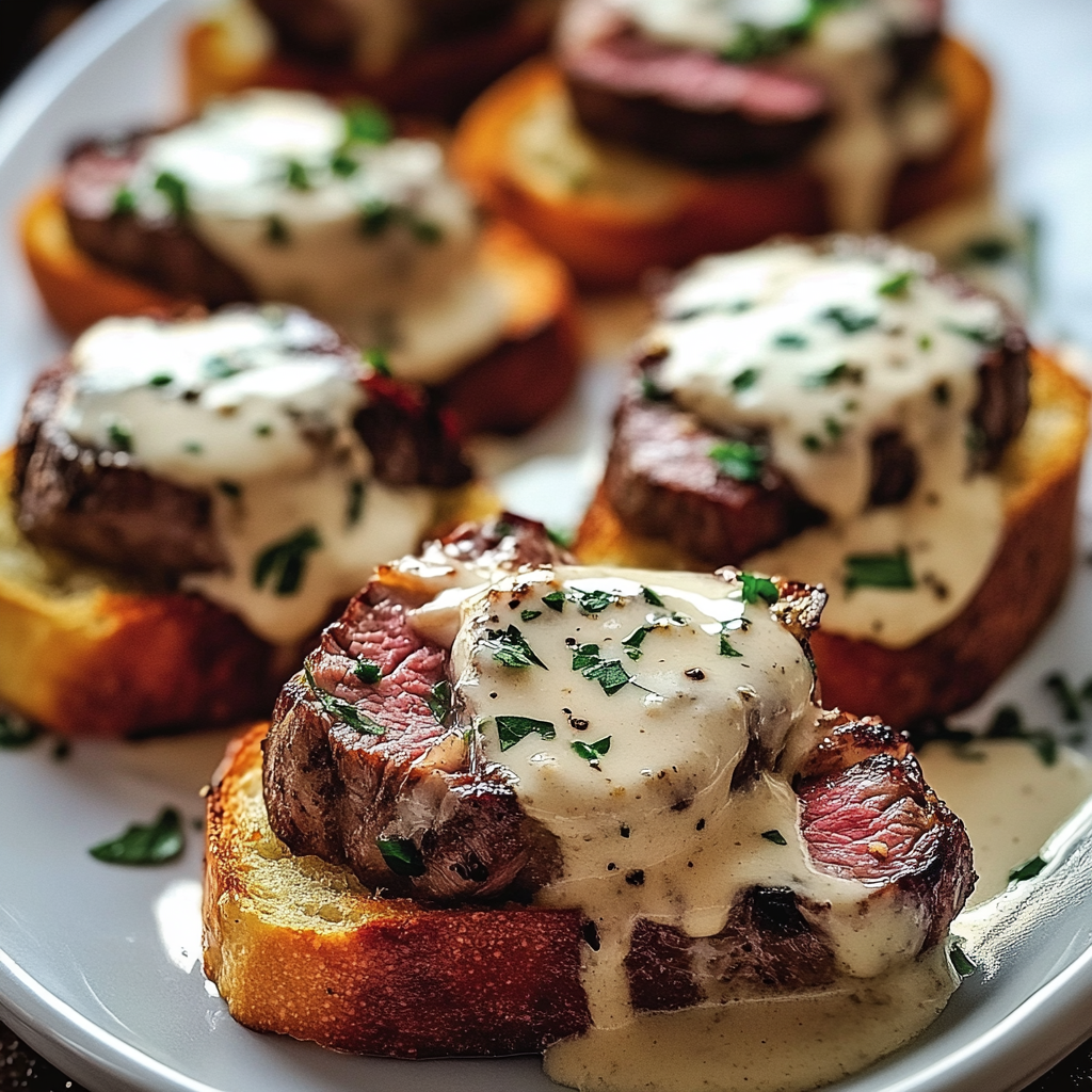 - Montage : Placez un morceau de filet de bœuf cuit sur chaque crostini.